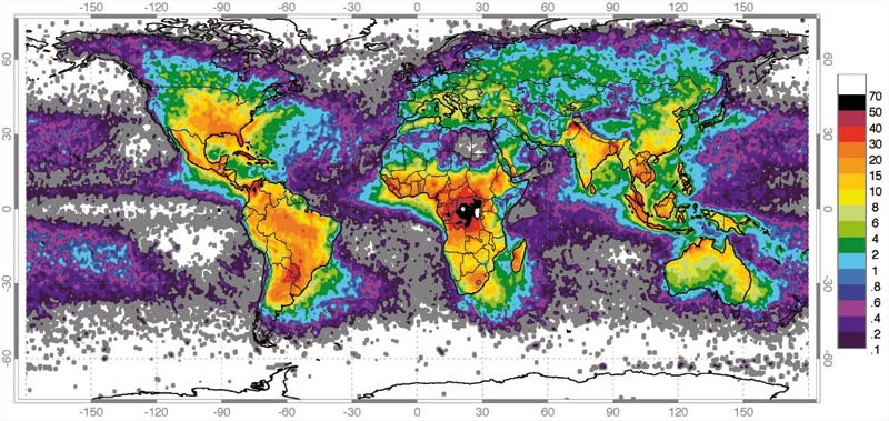 Globale Verteilung der Blitzhäufigkeit in jährlichen Einschlägen/km². Forschungen der NASA (z.B LIS) haben ergeben, dass die weltweit größte Blitzhäufigkeit im Kongobecken, speziell im Lee, d.h. westlich der Zentralafrikanischen Schwelle, zu finden ist.