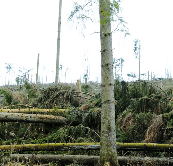 Wachsende Bäume entziehen der Atmosphäre laufend Kohlendioxid (CO²) und wandeln das mit Abstand wichtigste Treibhausgas in Biomasse um. In Wurzeln, Stamm und Ästen bleibt dieses CO² je nach Baumalter über einen längeren Zeitraum gebunden. In den letzten 100 Jahren stieg die Temperatur um +1,1 °C, die Winterniederschlagsmenge um 17% und die Sommerniederschläge verringerten sich um 14%. Die Folgen sind veränderte Wachstums- und Umgebungsbedingungen für die Hauptbaumarten. Durch häufige Stürme und Orkane besteht für einschichtige Fichtenwälder erhöhte Bruch- und Wurfgefahr. In trockenen Sommern nimmt die Vermehrung von Schadinsekten (z. B. Fichtenborkenkäfer) sprunghaft zu. Für viele Laubbäume verbesserten sich dagegen die Bedingungen. In Thüringen soll langfristig in den nächsten hundert Jahren ein naturnaher Waldumbau mit veränderter Baumartenzusammensetzung erfolgen. Der Fichtenanteil muß reduziert und das Laubholz (z. B. Buche und Ahorn) soll erhöht werden.