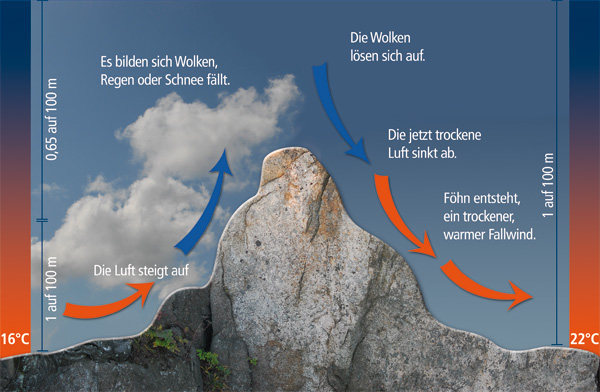 Beispielsweise herrscht häufig eine Föhnwetterlage auf der Alpennordseite, während es südlich der Alpenzentralkette regnet, genauer gesagt zu Steigungsregen kommt.