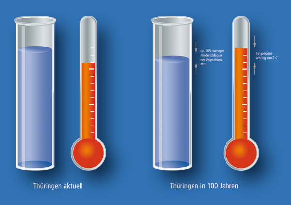 In Thüringen zeigt sich der Klimawandel in den nächsten 100 Jahren in der Verringerung der Niederschläge im Mittel um 10 % in der Vegetationszeit und in einer Erhöhung der Temperatur im Mittel um 2°C.