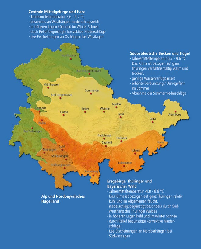 Prägend für das Klima in Thüringen sind vor allem die Mittelgebirge Thüringer Wald und Schiefergebirge, Rhön und Harz, aber auch die kleineren Höhenzüge, wie der Hainich und im Norden und Nordosten Hainleite, Kyffhäuser, Finne, Schrecke und Schmücke. Alle Erhebungen führen in Luv und Lee zu typischen klimatologischen Erscheinungsbildern bei den meteorologischen Größen Lufttemperatur, Windrichtung und -geschwindigkeit, Niederschlag und Sonnenscheindauer (Globalstrahlung).